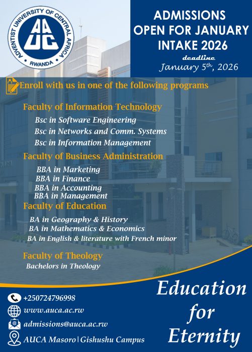 The Adventist University of Central Africa is pleased to announce the January, 2026 Intake for undergraduate and masters’ programmes, at all of its campuses (Masoro, Gishushu). Admissions are open in the programmes listed below: Undergraduate Studies Faculty of Theology School of Medicine: MD of General Medicine Faculty of Health Sciences […]